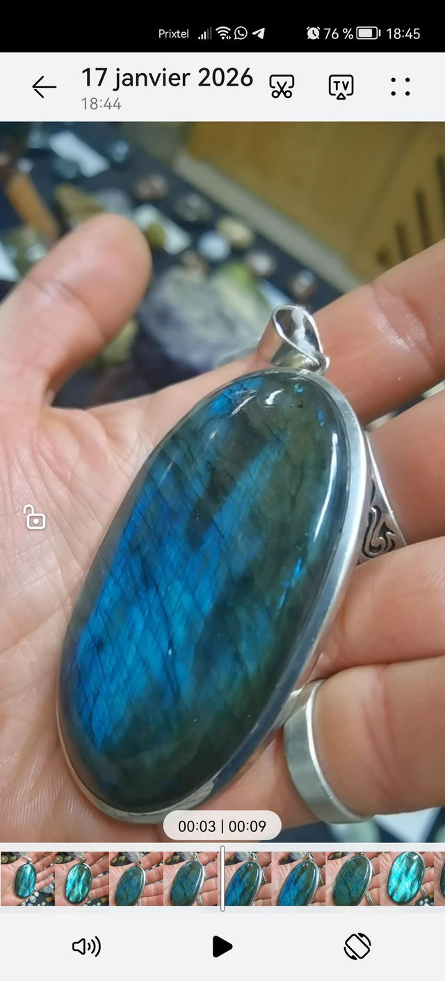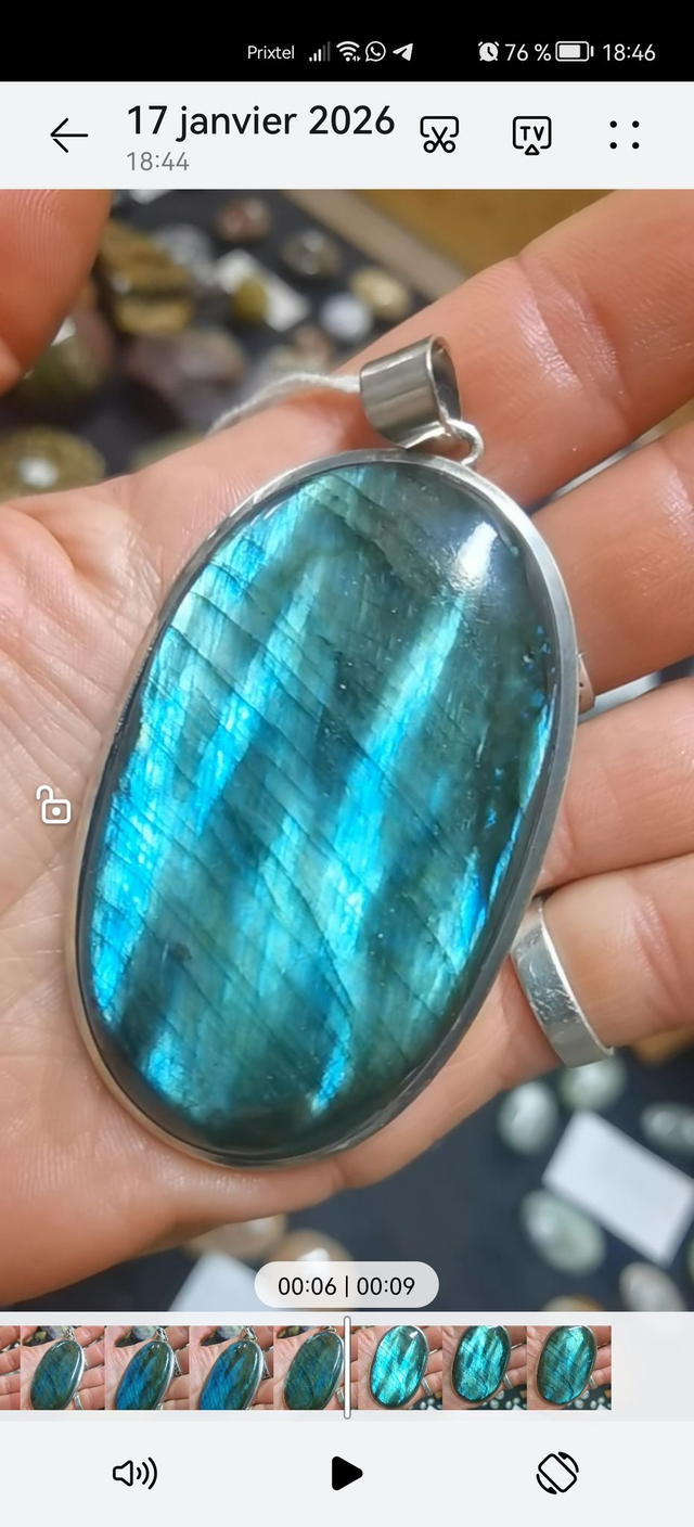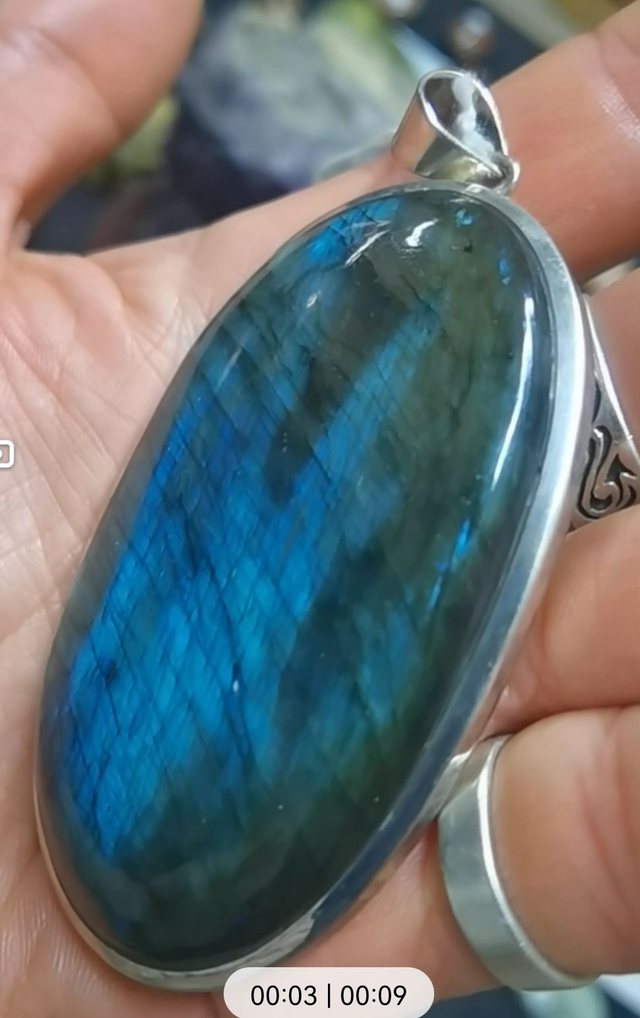 Pendentif Labradorite ovale à reflets bleu clair et électriques (environ 75 x 45 x 8 mm).