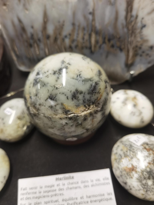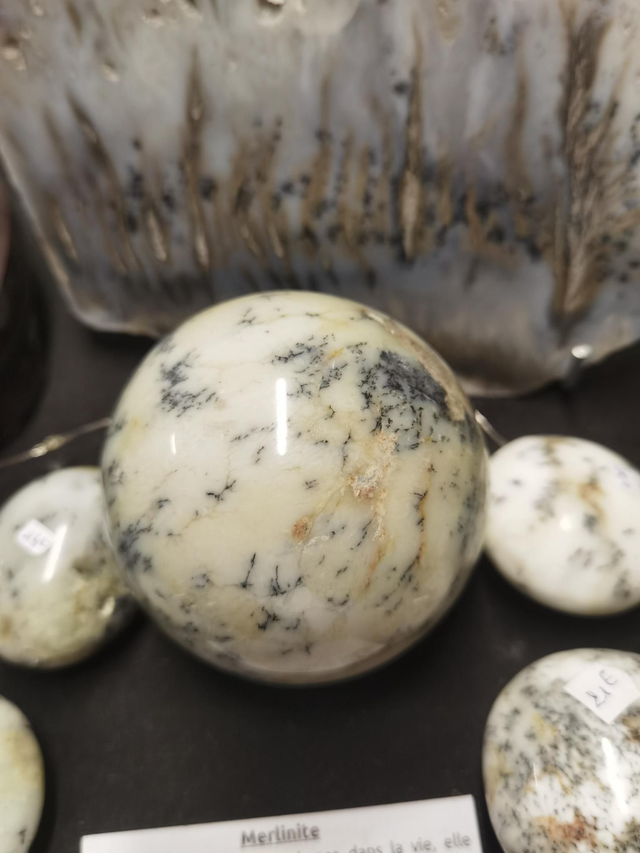 Sphère polie de Merlinite (opale blanche dentritique) de 85 mm de diamètre.